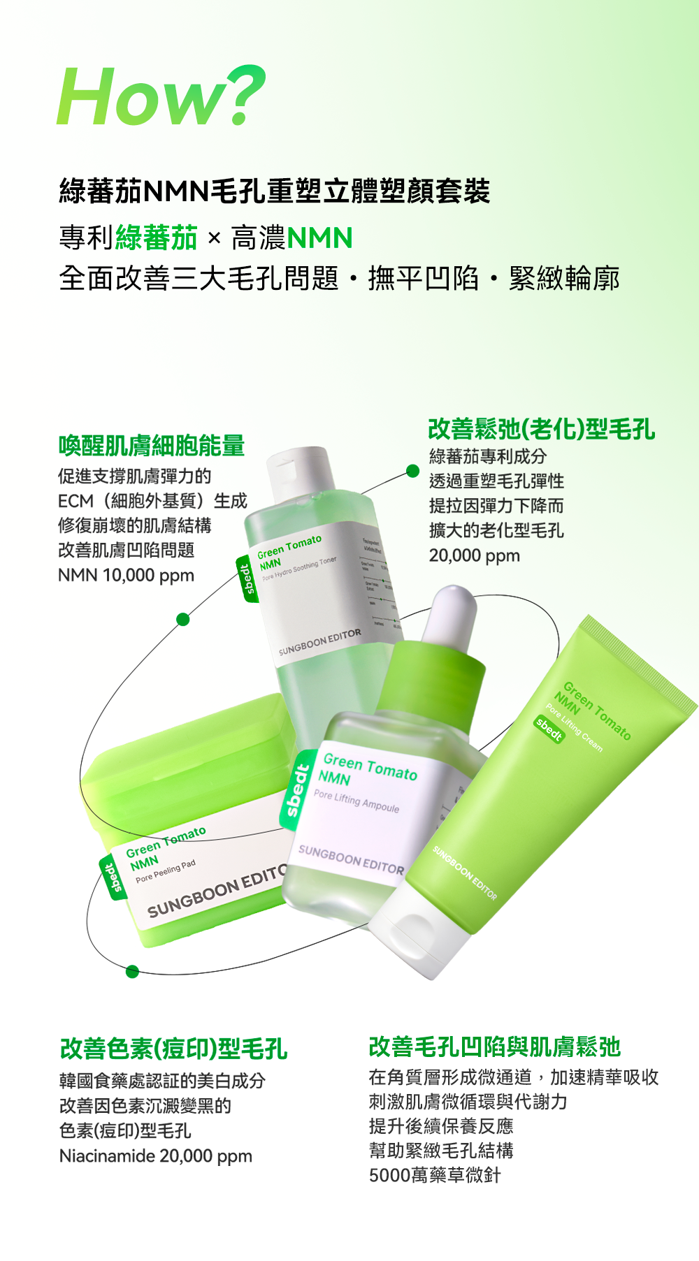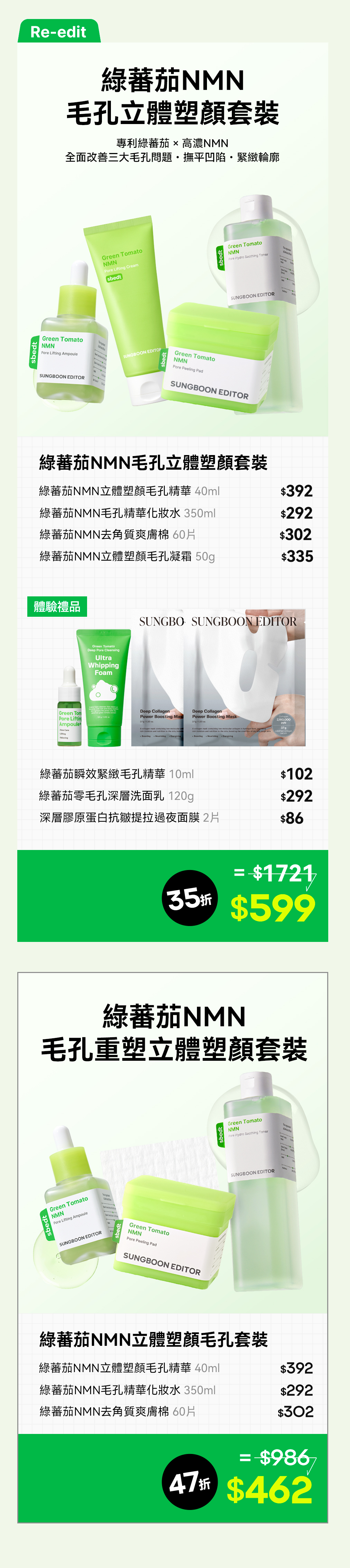 四部曲💚「NMN去角質爽膚棉」、「NMN立體塑顏毛孔精華」、「NMN毛孔精華化妝水」及「NMN立體塑顏毛孔凝霜」